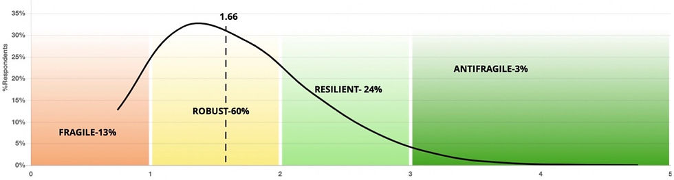 Would it be reasonable to apply these terms to human beings? Using our resilience ratio, we have grouped the distribution of these pre-training participants. Only 3% are Antifragile, 24% are Resilient, 60% are Robust and 13% Fragile. Remember that the sample is from functioning senior staff at work.
